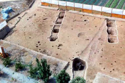 また、東武庫遺跡では弥生時代前期から中期初頭にかけての22基の方形周溝墓〔ほうけいしゅうこうぼ〕(埋葬施設の周囲を溝で方形に区画した墓)が見つかり、擬朝鮮系無文〔むもん〕土器と呼ばれる弥生時代早期から前期前半にあたる時期に朝鮮半島で作られた土器に近い形の壺が出土しています。これは、弥生時代に各地に広まる方形周溝墓のなかではもっとも古いもののひとつで、擬朝鮮系無文土器の出土とともに、方形周溝墓がいつどこでどのように出現したかを考えるうえで重要な発見となっています。