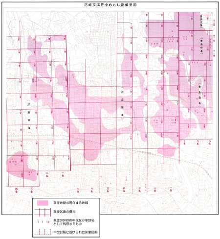 『尼崎市史』第1巻(昭和41年)付図4「尼崎市域を中心とした条里図」をもとに、河辺南条の里の復元についてはその後の研究成果による修正を加えて作成しました。