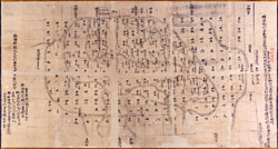 写真2を見ると、マス目ごとの文字表記は詳細なものから番号だけのものまでありますが、大きく三つのグループに分類することができます。(1)図の中央上部あたりから右下に見える、番号、○○田という名称、面積、上・中・下のランクからなるもの、(2)左上部から中央下部に見える番号と面積からなるもの、(3)右から中央最下部に見える、番号のみのものです。番号が全体で共通していますが、これは条里の坪番号です。(1)では、これに加えて水田の名称が記され、さらに面積(これは東大寺の領有する分の面積)と田品、つまり水田の良し悪しが記されています。(2)の面積はもちろん東大寺の領有する面積です。実はこのような詳細な水田に関するデータこそが東大寺にとって重要なものなのであって、この記載があってこそ、この図は東大寺領猪名荘の存続を支える「公験〔くげん〕」(官府が土地所有権の移転を公認する文書)として意味を持ち、存在価値が生まれるのです。猪名所図は現在、普通に考える「地図」とは性格が異なるものなのです。