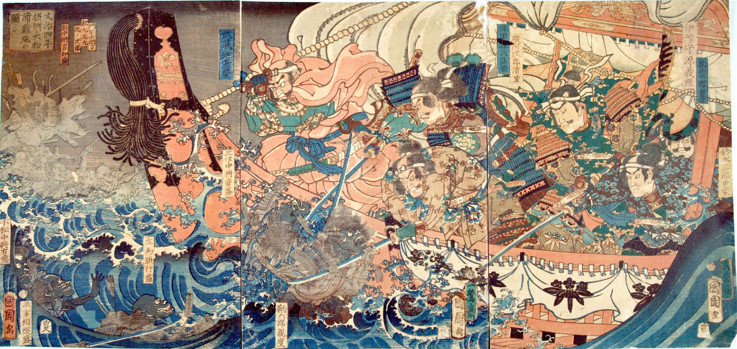 「摂州大物浦難風之図」(地域研究史料館蔵) 豊原国周画の木版刷浮世絵 3枚1組 文治元年(1185)源義経主従が大物湊から船出したものの、平家の怨霊に悩まされて難渋している光景を描いています(本編第2節「この節を理解するために」掲載図参照)。
