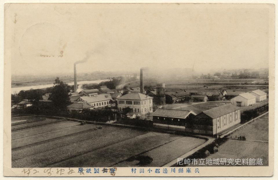 撮影年代:円柱形の構造物に「野田製…」とあり 大阪製紙が解散、明治43(1910)野田製紙所と改称 大正4(1915)富士製紙が買収、富士製紙神崎工場となる